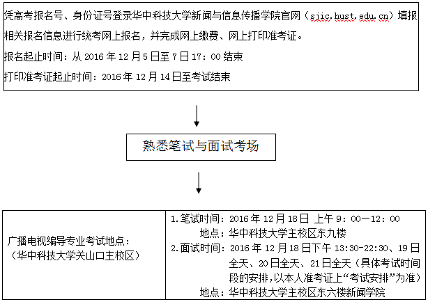 已在高考網報時選報了戲劇與影視學類廣播電視編導專業的考生,請于2016年12月5日8:30至12月7日17:00,憑高考報名號及身份證號登錄華中科技大學新聞與信息傳播學院官網(sjic.hust.edu.cn),填報相關報名信息進行專業科目統考網上報名并完成網上繳費。請考生合理安排時間,務必在規定時間內完成網上報名和網上繳費,網上報名系統關閉后不再安排補報。