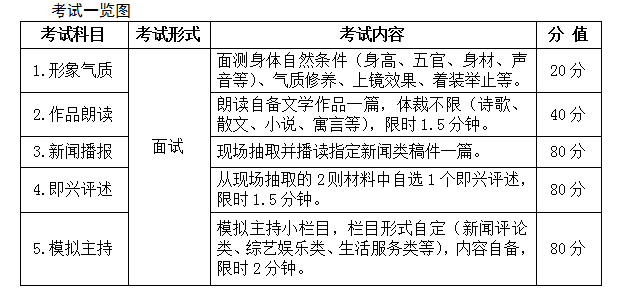 按照廣播、電視、網(wǎng)絡(luò)等電子傳媒受眾的基本審美標準,綜合考察考生的身體自然條件、氣質(zhì)修養(yǎng)、上鏡效果、著裝舉止等情況。