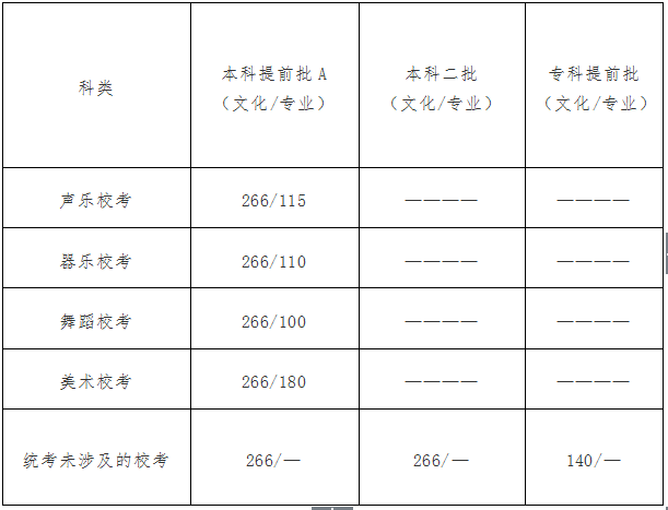 ⑴按教育部規(guī)定,部分獨(dú)立設(shè)置的藝術(shù)院校和參照執(zhí)行的院校(或?qū)I(yè))藝術(shù)類本科專業(yè),文化、專業(yè)錄取控制線由學(xué)校自行確定,我省統(tǒng)考涉及到的專業(yè),還需要我省相應(yīng)類別專業(yè)統(tǒng)考合格。其藝術(shù)類專科專業(yè):我省統(tǒng)考涉及的,文化、專業(yè)錄取控制線按我省相應(yīng)統(tǒng)考類執(zhí)行;我省統(tǒng)考未涉及的,文化控制線為140分,專業(yè)控制線由院校確定。