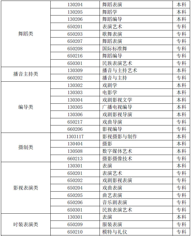 (一)《普通高等學校本科專業目錄(2012 年)》中“藝術學門類”下設各專業,以及《普通高等學校高等職業教育(專科)專業目錄(2015 年)》中“藝術設計類”“表演藝術類”下設各專業和“民族文化類”“廣播影視類”等部分專業,可編制藝術類招生計劃。