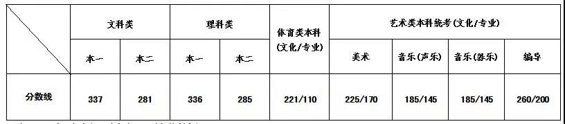 2.除獨立設置本科藝術院校和參照獨立設置本科藝術院校招生的院校以外的其他院校本科校考專業的省最低控制分數線:文化185分/專業合格。其中,取得音樂表演、音樂學、作曲與作曲技術理論、廣播電視編導、美術學、繪畫、雕塑、中國畫、實驗藝術、藝術設計學、視覺傳達設計、環境設計、產品設計、服裝與服飾設計、公共藝術、工藝美術、數字媒體藝術、藝術與科技、陶瓷藝術設計專業校考合格的考生,還須參加相應專業省統考,且美術省統考成績須達到160分,音樂省統考成績須達到120分,編導省統考成績須達到190分。