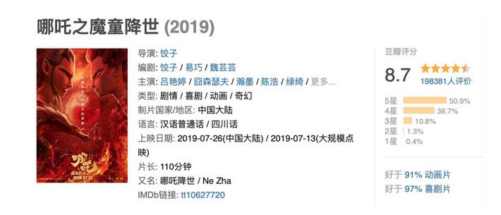 本周最熱的院線片,無疑就是這部《哪吒之魔童降世》。豆瓣近20萬人評價,仍然是8.7分的高評分。