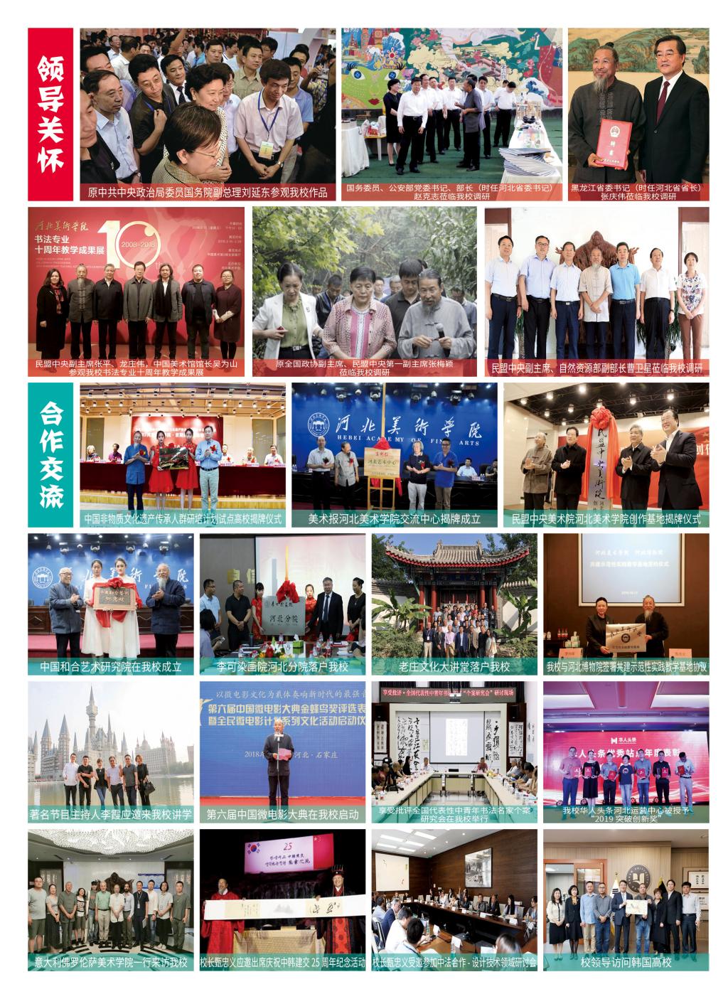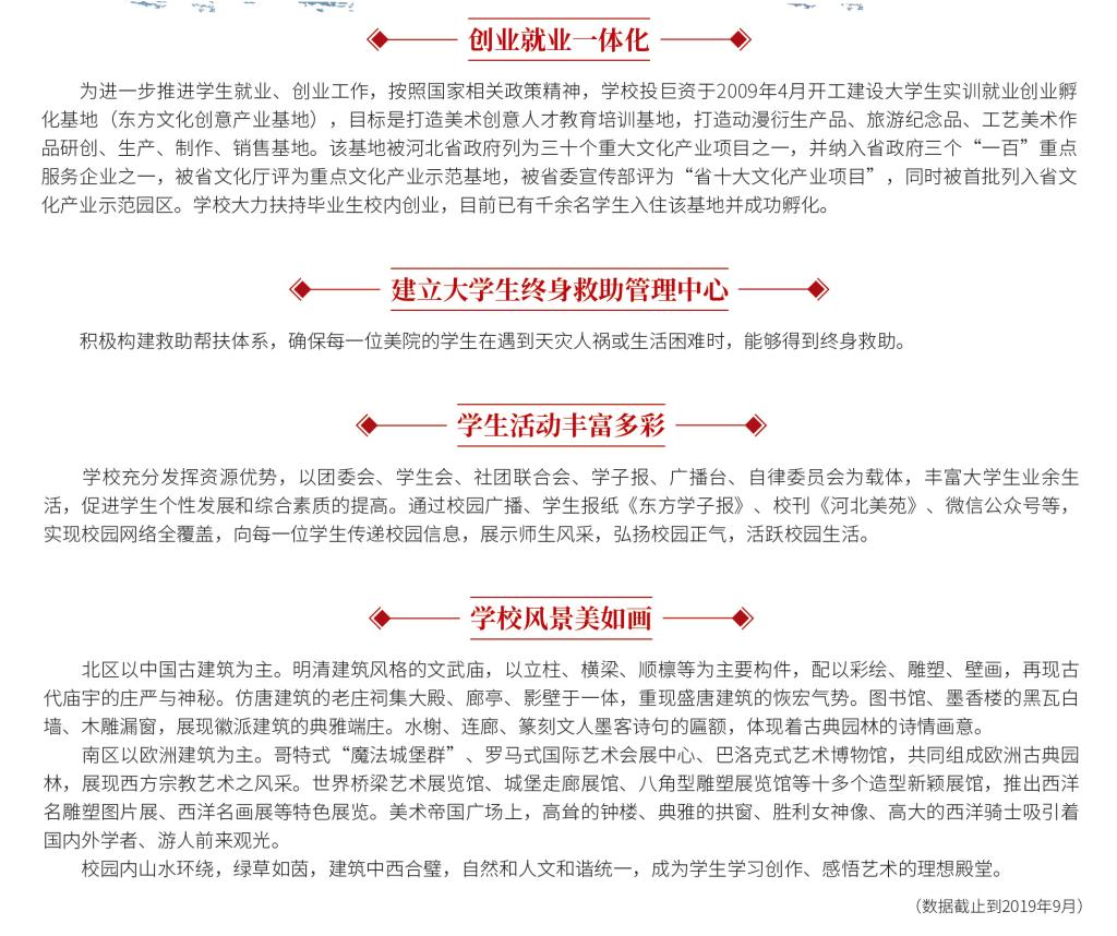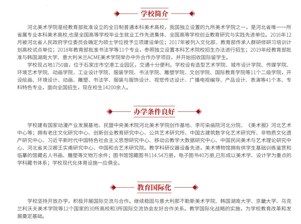 河北美術學院是經教育部批準設立的全日制普通本科美術高校,我國獨立設置的九所美術學院之一,是河北省唯一一所省屬專業本科美術高校,也是全國高等學校畢業生就業工作先進集體、全國高等學校創業教育研究與實踐先進單位。2016年12月被河北省人民政府學位委員會確定為碩士學位授予立項建設單位;2017年被列入文化部、教育部傳承人群研修研習培訓計劃高校試點單位;2018年教育部批準書法學等11個專業,參照獨立設置本科藝術院校招生辦法進行招生;2019年經教育部批準與韓國湖南大學、意大利米蘭ACME美術學院舉辦中外合作辦學項目。并開始招收國際留學生。