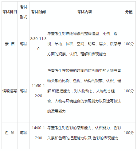 考試共設3個科目,分別考察考生的造型能力及色彩表現能力、形象記憶及閱讀與想象力。專業成績滿分為300分。考試科目具體分值如下:
