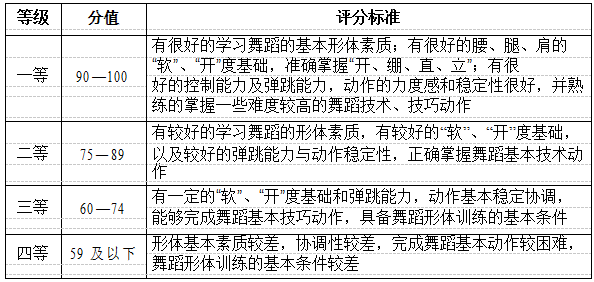 考查考生形體條件,身體各部分軟開度,彈跳能力,要求考生具有體態勻稱、五官端正、健康挺拔、氣質好的形體條件;軟開度好,彈跳能力強;